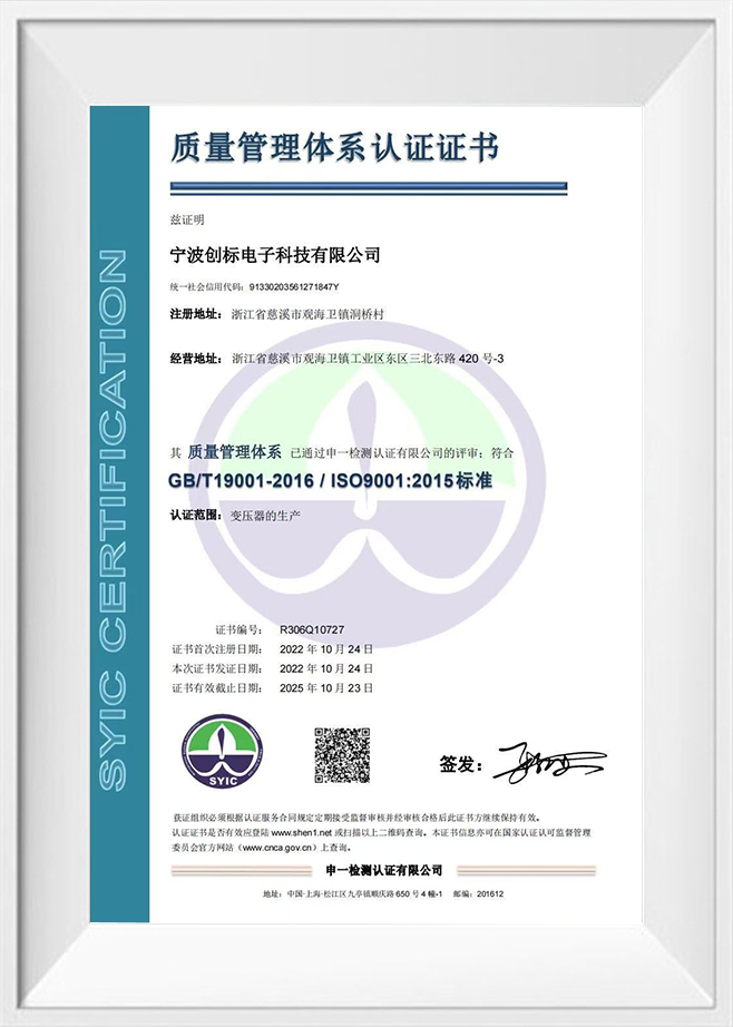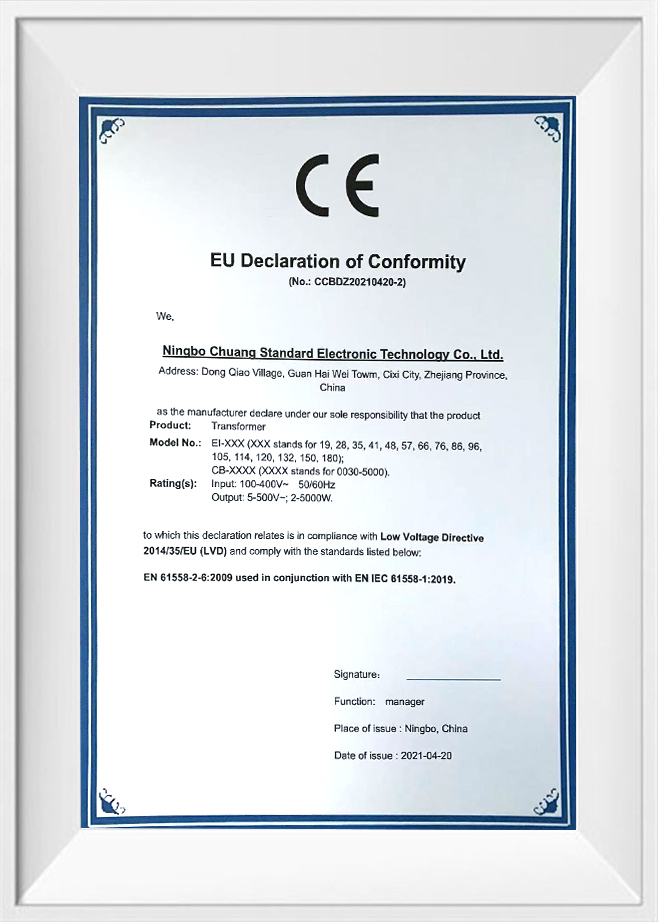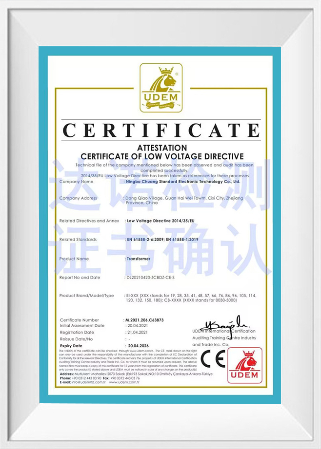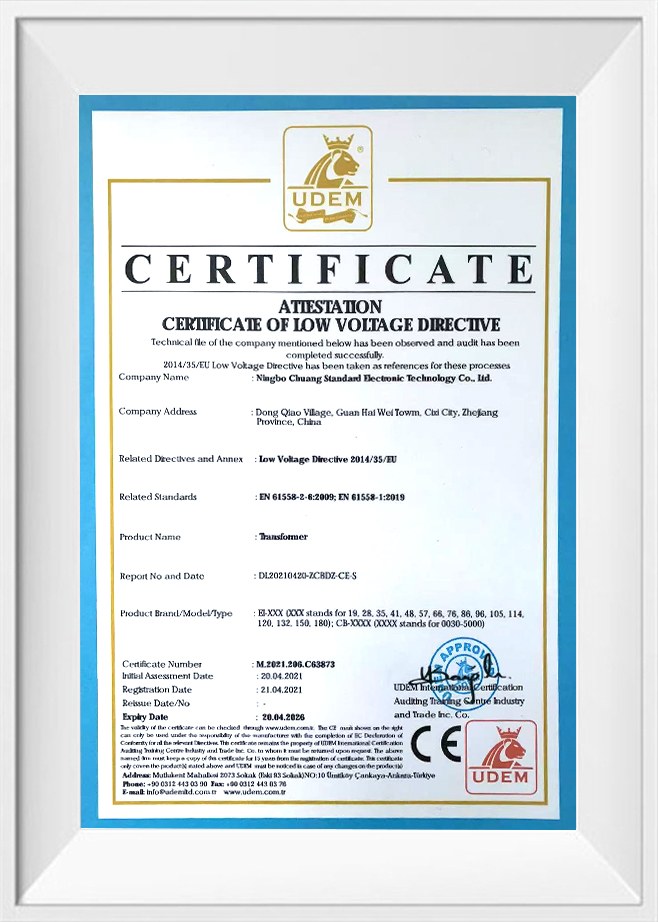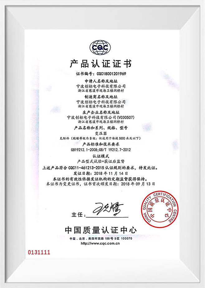 En tant que professionnel Custom Transformer Manufacturers et Transformer Exporter, À l'heure actuelle, la société a formé le transformateur EI comme fonctionnalité, et produit toutes sortes de transformateurs de bague, C transformateurs de puissance C, transformateurs médicaux, transformateurs audio, transformateurs à haute tension, transformateurs de contrôle industriel, anti-socle, réacteurs, transformateurs à haute fréquence et autres produits. La société a une structure organisationnelle complète pour fournir l'intégralité du processus de la conception, de l'approvisionnement, de la fabrication, de l'assurance qualité, de la logistique, des ventes et du service client. Nous sélectionnons des matériaux de fournisseurs approuvés de haute qualité conformément aux normes ISO9001, nos employés sont spécialement formés et utilisent la technologie la plus avancée d'aujourd'hui, y compris les machines CNC et les systèmes de test automatisés, et chaque transformateur que nous fabriquons passe une inspection et des tests de qualité complète avant de quitter l'usine. Nous avons une solide équipe de développement technique, les membres ont plus de sept ans de développement de produits et d'expérience en production et d'assurance qualité, dans l'industrie, dans l'industrie, a une certaine réputation et une certaine influence, nous nous sommes engagés à fournir aux clients les services les plus étendus, y compris des conseils techniques complets. La société a adopté la certification du système qualité ISO9001, la certification de la qualité des produits CQC, la certification de la protection de l'environnement ROHS, etc. L'intégrité, la force et la qualité des produits de la société ont été reconnus par l'industrie. La technologie électronique de Ningbo Chuangbiao est située dans le pont de la baie de Hangzhou de Zhejiang, bienvenue des amis de tous horizons pour visiter, des conseils et des négociations commerciales.